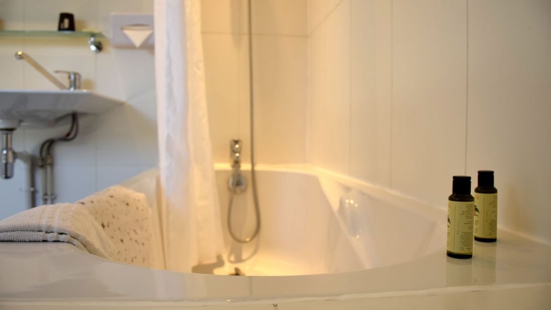 Chambre avec lit de 160cm, salle de bain privative avec vue jardin.
